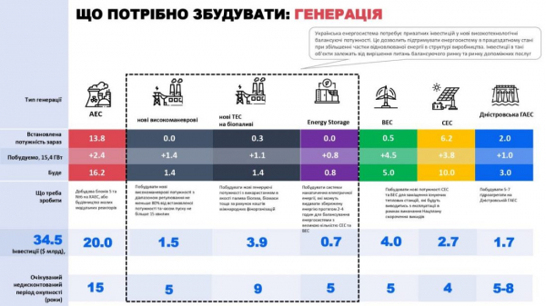 “Також планують запровадити спеціальні аукціони на закупівлю допоміжних послуг строком понад рік для забезпечення частоти та активної потужності з метою сприяння інвестиціям у нові маневрові генерувальні потужності та установки зберігання енергії”.