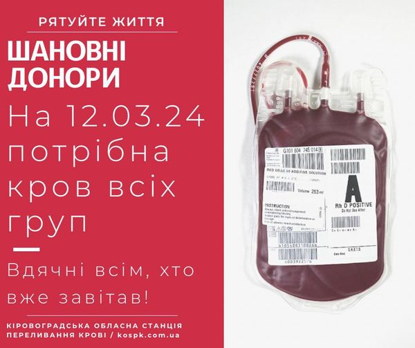 На сьогодні, 12 березня, Кіровоградська обласна станція переливання крові потребує кров усіх груп.