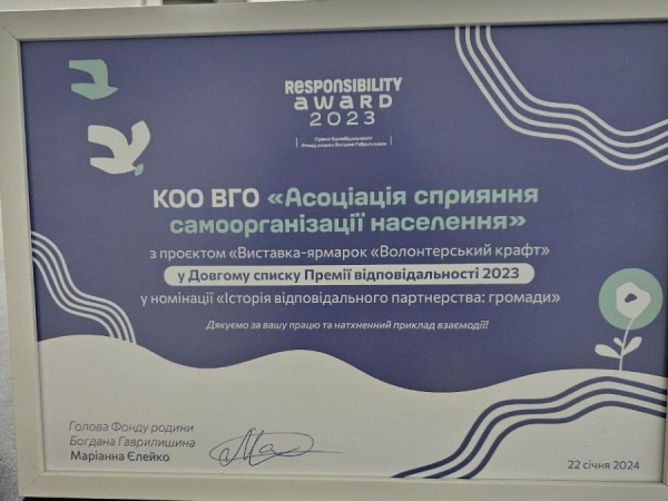 Ініціатива “Виставка-ярмарок “Волонтерський крафт” потрапила до списку 50 найкращих історій відповідального партнерства, відзначених Премією відповідальності Фонду родини Богдана Гаврилишина 2023. Нагородження лауреатів та фіналістів відбулося в Києві з нагоди Дня соборності України.