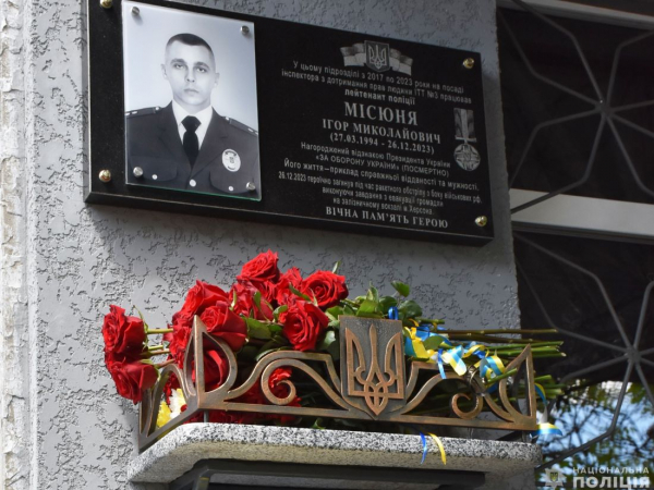 У Долинській відкрили меморіальну дошку загиблому лейтенанту поліції Ігорю Місюні, який отримав смертельне поранення під час евакуації людей із залізничного вокзалу в Херсоні 26 грудня 2023 року.