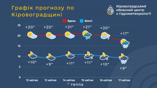 З 15 по 17 квітня нічні температури повітря коливатимуться в межах 7-13° тепла, а денні в межах – 16-23° тепла.