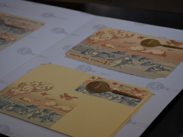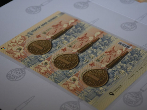 Сьогодні, 27 червня, в Кропивницькому погасили нову поштову марку “Податки. Армія. Перемога”. На ній зображена монета НБУ номіналом 1 гривня, яка перетворюється на зброю – кулю.