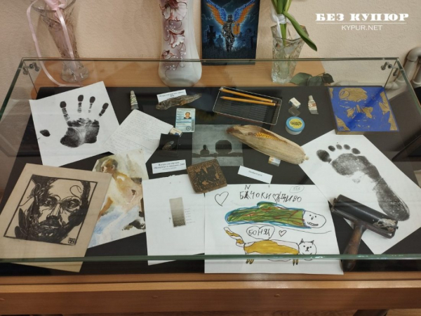 Тут є й особисті речі Володимира, серед них студентський квиток, засушений бичок, качан кукурудзи. Є також експозиція, яка вже говорить про воїна -“Кару” – оповідки, які Володимир писав на фронті, а потім відправляв рідним у повідомленнях. З цих історій близькі зробили збірку під назвою “Кара мовчить”. Бо тепер мистецтво і війну відділити неможливо.