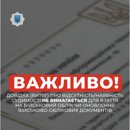 “Увага довідка (витяг) про відсутність чи наявність судимості не вимагається для взяття на військовий облік чи оновлення військово-облікових документів. Через поширення неточної інформації у соцмережах, сервіси МВС наразі перевантажені запитами від громадян. Відповідно час обробки заявок збільшується. Просимо з розумінням поставитися до можливих затримок у видачі довідок”, – йдеться в офіційному повідомленні.