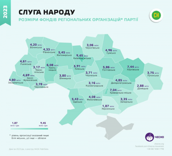 Торік найбільше коштів з державного бюджету отримала партія “Слуга народу” – 475,6 млн грн. Адже це партія влади, яка має найбільше місць у парламенті (наразі 235 депутатів). ЇЇ регіональні осередки отримали 121,6 млн гривень. Також частину коштів вони отримали від громадян як донати.