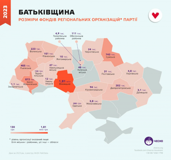 Партія “Батьківщина” торік загалом отримала 90 млн грн із держбюджету. Бюджетний фонд Кіровоградської обласної організації склав 94 тис. грн. Регіональні осередки більшість коштів витрачали на адміністративну діяльність — оренду офісів, податки й збори. Окрім сусідньої Вінниці, де близько мільйона витратили на рекламу, зокрема й на розміщення рекламних публікацій в газетах.