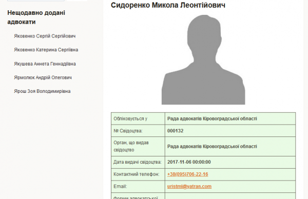 Микола Сидоренко — колишній заступник прокурора області, у 2017 році отримав свідоцтво адвоката. При цьому за інформацією порталу “Адвокати України”, адреса, за якою він працює, — Кропивницький, вул. Братиславська, 82. За цією ж адресою знаходиться м’ясокомбінат “Ятрань”, бенефіціарним власником якого є голова Кіровоградської ОВА Андрій Райкович. Про причетність до підприємства свідчить і вказана Сидоренком адреса електронної пошти – [email protected].