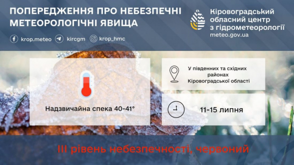 Протягом зазначеного періоду в південних та східних районах Кіровоградської області очікується надзвичайна спека 40-41°.