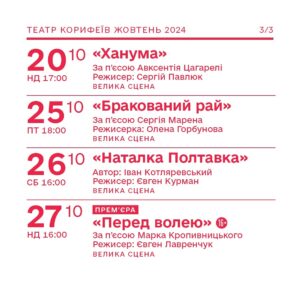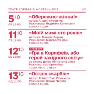 Друзі, готуйтеся! Наш улюблений Театр корифеїв збирається влаштувати справжній культурний феєрверк цієї осені. У жовтні нас очікує аж 12 вистав – від комедій до драм. Запасайтеся попкорном (ой, перепрошую, це ж не кіно), тобто беріть монокль або бінокль та сідайте зручніше – зараз розповімо, що ж нам підготували наші талановиті актори.