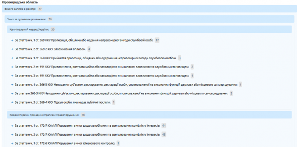 30 із 77 правопорушень кваліфікуються як кримінальні злочини, 46 – як адміністративні порушення та ще одне — дисциплінарне.