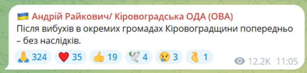 Начальник Кіровоградської ОВА Андрій Райкович у своєму телеграм-каналі повідомив, що після вибухів в окремих громадах Кіровоградщини попередньо – без наслідків.