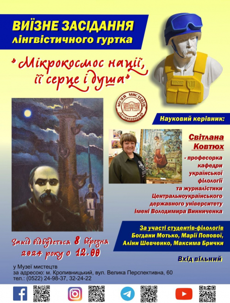 Професорка Світлана Ковтюх та студенти-філологи Центральноукраїнського державного університету ім. В. Винниченка 8 березня в Музеї мистецтв у Кропивницькому обговорять, чому Тарас Шевченко — мікрокосмос нації, її серце та душа.