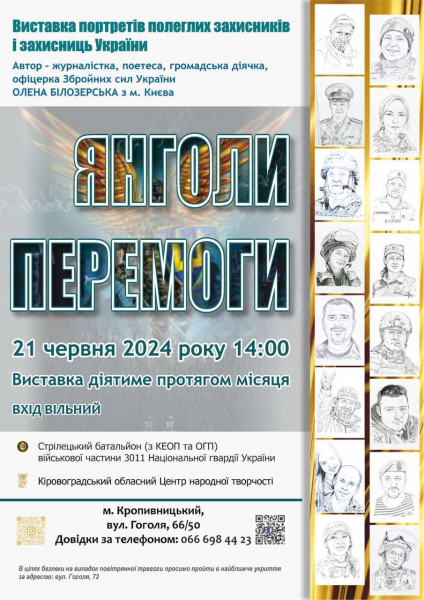 У п’ятницю, 21 червня, о 14:00 в Кіровоградському обласному Центрі народної творчості презентують виставку портретів полеглих на війні захисників та захисниць авторства Олени Білозерської під назвою “Янголи перемоги”.