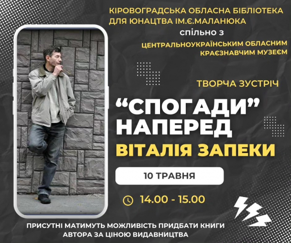 Зустріч відбудеться в Кіровоградській обласній бібліотеці для юнацтва ім. Є. Маланюка 10 травня о 14:00.
