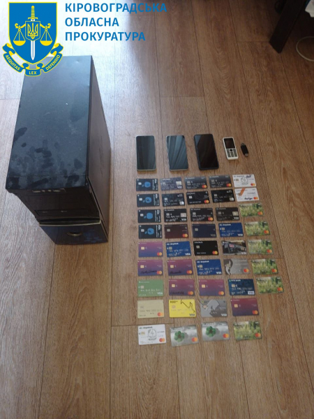 Під час обшуків офісного приміщення виявили та вилучили 145 печаток підприємств, печатку органу державної влади, комп’ютерну техніку, 76 мобільних пристроїв, 324 банківські картки та чорнову бухгалтерію.