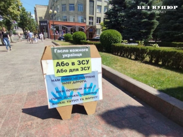 Написи на плакатах протестувальників чітко дають зрозуміти перехожим, чому ці люди стоять перед міськрадою – “Гроші на ЗСУ, а не на тротуари та дороги”, “Красиві бруківки, красиві сквери, затишні кав’ярні, а нулі все ближче й ближче, а хлопців все менше й менше” та “Гроші на ЗСУ, а не на дороги”.