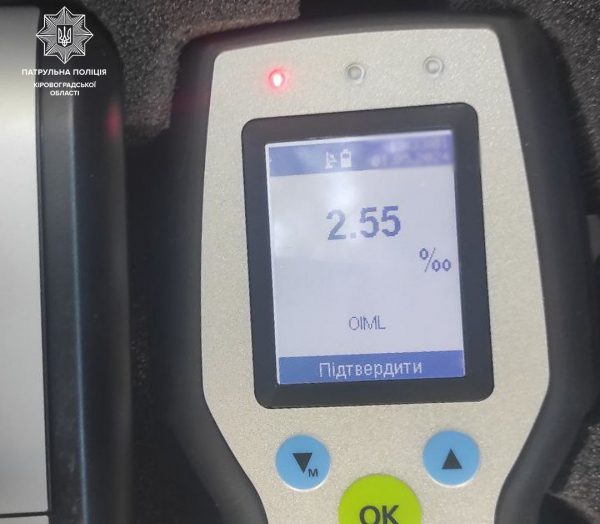 Прилад Драгер показав 2,55 проміле – це майже в 13 разів більше допустимої норми.