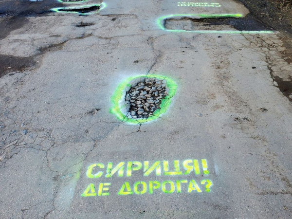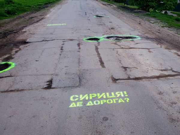 “На дорожньому полотні по вулиці Незалежній у Новгородці з’явилися написи “Сириця! Де дорога?”, а ями обведено жовтою фарбою для кращої видимості й попередження водіїв про небезпеку. Саме цю дорогу відділ ЖКГ селищної ради відремонтував декілька місяців тому, виділивши на її ремонт більше 3-х мільйонів гривень”.