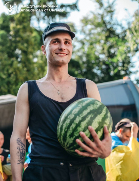Звільнений український військовий тримає кавун, який йому подарували пересічні люди на рідній землі.